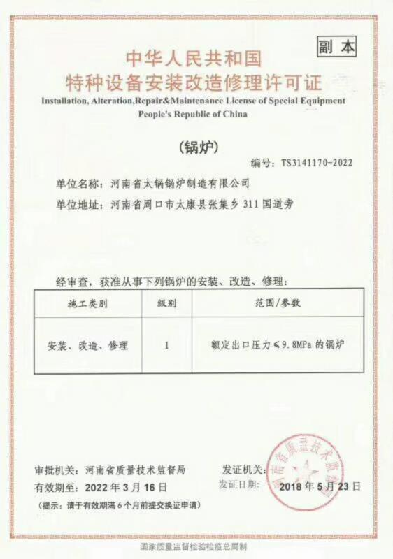 河南省太鍋鍋爐制造有限公司(原河南省太康鍋爐廠始建于1976年)始建于70年代初,經(jīng)40多年的艱辛探索,靠科技興業(yè),走科學管理之路,現(xiàn)已發(fā)展成為承接制造、安裝、設(shè)計大、中型供熱系統(tǒng),生產(chǎn):SZS燃油燃氣蒸汽鍋爐、燃煤蒸汽鍋爐、燃油鍋爐、燃氣鍋爐、電加熱鍋爐、生物質(zhì)鍋爐、茶水鍋爐、有機熱載體鍋爐、熱風鍋爐,蒸壓釜、燃油蒸汽鍋爐、燃氣蒸汽鍋爐、燃油熱水鍋爐、燃氣熱水鍋爐并承擔安裝120噸熱水鍋爐、蒸汽鍋爐,生物質(zhì)鍋爐,加工制造一、二類蒸壓釜、壓力容器,化工機械的省一級**企業(yè)。